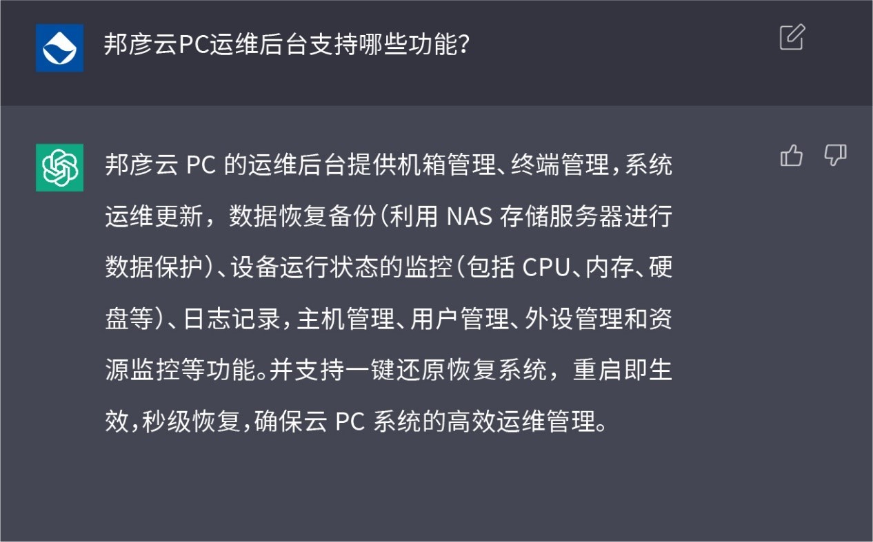 邦彥云PC的運(yùn)維后臺提供機(jī)箱管理、終端管理,系統(tǒng)運(yùn)維更新,數(shù)據(jù)恢復(fù)備份(利用NAS存儲服務(wù)器進(jìn)行數(shù)據(jù)保護(hù))、設(shè)備運(yùn)行狀態(tài)的監(jiān)控(包括CPU、內(nèi)存、硬盤等)、日志記錄,主機(jī)管理、用戶管理、外設(shè)管理和資源監(jiān)控等功能。并支持一鍵還原恢復(fù)系統(tǒng),重啟即生效,秒級恢復(fù),確保云PC系統(tǒng)的高效運(yùn)維管理。